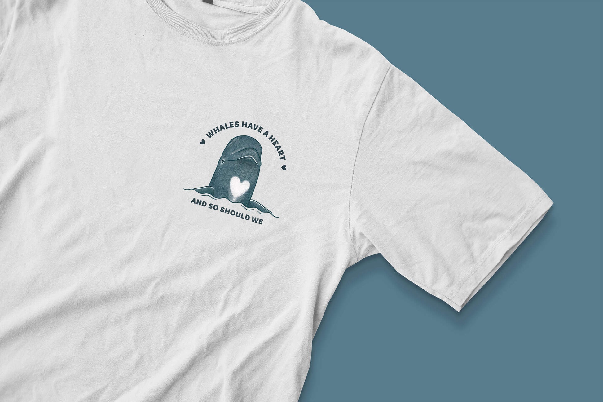 This shirt features a happy pilot whale spy-hopping from the ocean, a white heart on its chest. I created this piece as a simple reminder that empathy matters. In a world where hate and violence is rising, we can choose to stay human. To care for other humans. And to care for animals.